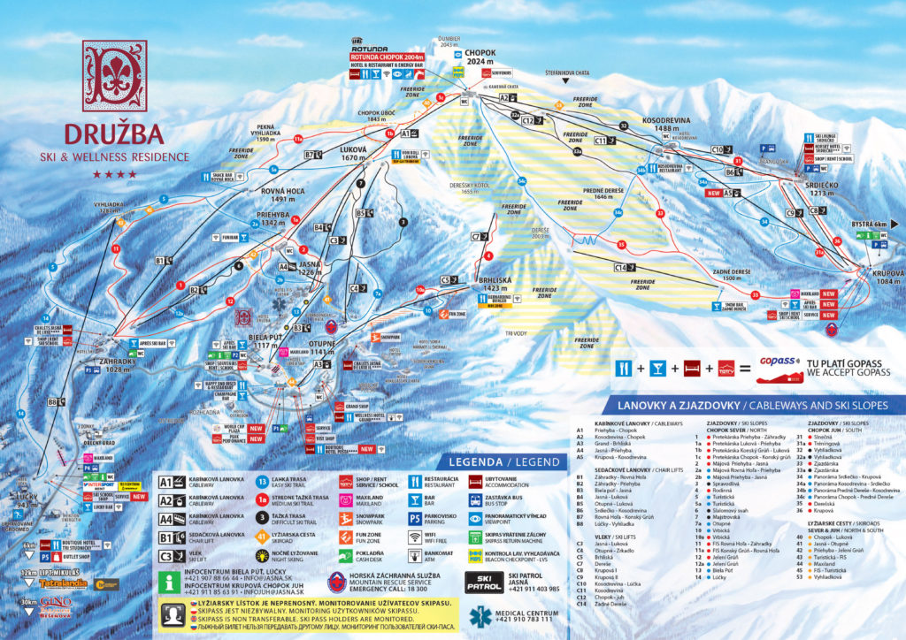 Розташування: Готель Ski & Wellness Residence Družba**** розташований у Деменівській долині, найкрасивішій долині Низьких Татр, на північних схилах Низьких Татр. Це розгалужена гірська система з головним хребтом, що простягається на 82 км зі сходу на захід. Найвищі вершини перевищують висоту 2000 м над рівнем моря. Готель розташований на найкращому та постійно розвиваючомуся гірськолижному курорті Словаччини Ясна-под-Хопком, прямо на лижній трасі Бела Шлях. Чотиримісний фунікульор дозволяє починати та закінчувати катання на лижах прямо біля готелю